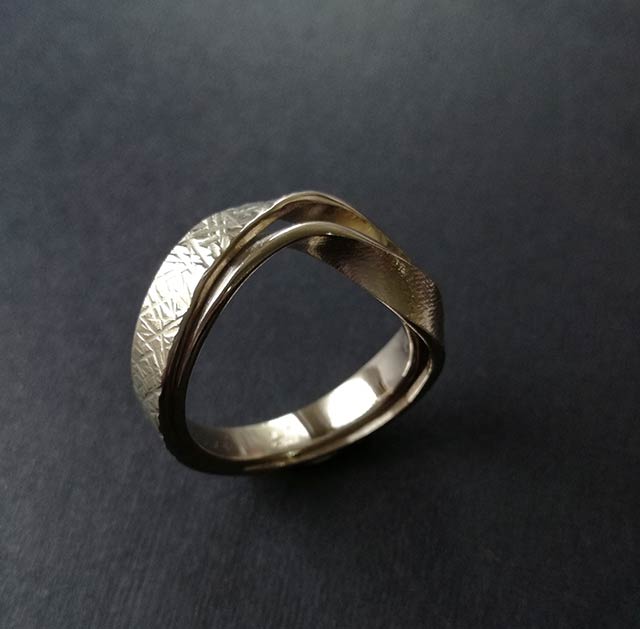 Un nastro d’oro bianco è martellato, l’altro è graffiato.