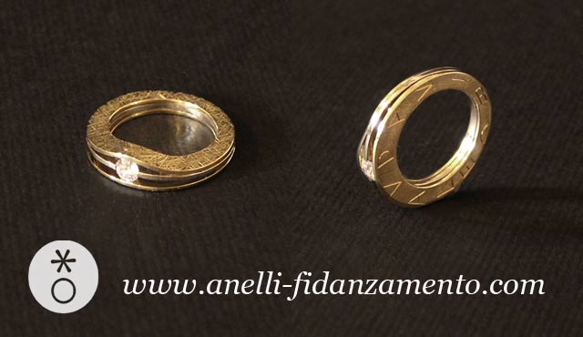 La sua idea era avere entrambi i nomi incisi su un anello bicolore, dalla forma lineare ma importante e con un diamante etico. Insieme abbiamo disegnato un solitario formato da tre dischi, quelli esterni in oro giallo e quello interno in oro bianco, che trattengono un diamante da 0,21 carati dal taglio rotondo, una forma molto geometrica e pulita. Davide ha voluto seguire da vicino tutta la fase di progettazione e realizzazione, così da creare un anello personalizzato grazie al nome inciso ma anche grazie al suo grande contributo di idee. Ha scelto una finitura satinata da un lato e battuta dall’altro, con i profili esterni lucidati a specchio. Infine ha deciso di incidere entrambi i loro nomi anagrammandoli su una delle facce esterne dell’anello.