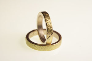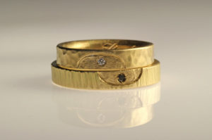 Eva e gli sposi sono ripartiti da zero con la progettazione, insieme, e hanno concepito due fedi nuziali concettuali bicolore: dentro oro bianco, fuori oro giallo! Inoltre gli anelli presentano...