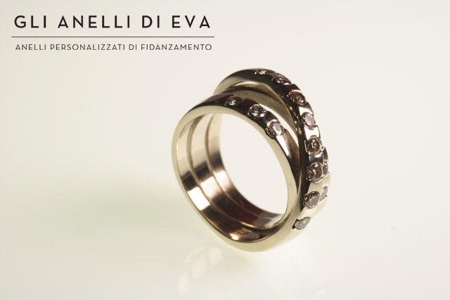 Per prima cosa ho liberato le pietre dai vecchi anelli e le ho pulite, così mi sono accorta che erano di colore leggermente diverso: in un anello erano bianche, nell’altro quasi champagne. A quel punto ho proposto a Daniela alcuni schizzi e insieme abbiamo scelto un anello intrecciato in oro bianco asimmetrico, ornato con pietre di entrambe le colorazioni.