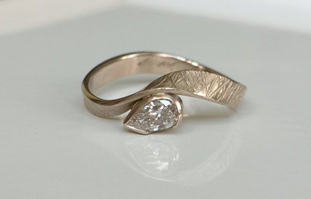 Anello in oro etico con diamante etico canadese a goccia.
