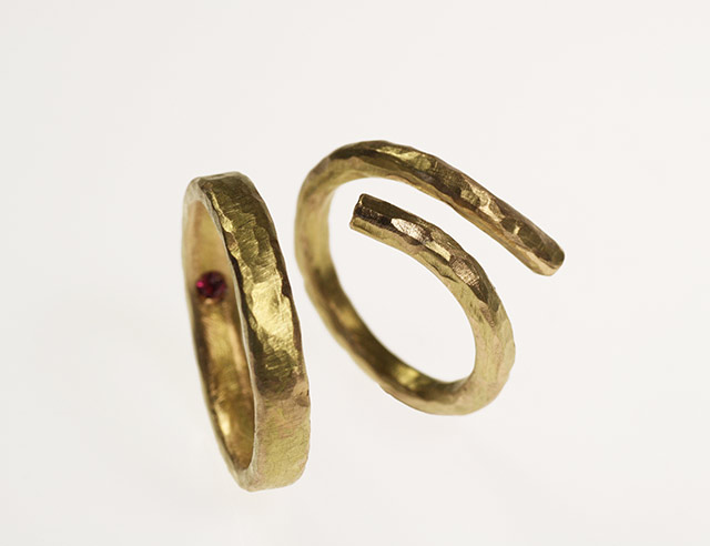 Oltre all’oro abbiamo riciclato anche tre piccoli rubini della mamma, li ho fatti incastonare uno dentro la fede di lui e gli altri alle due estremità della stravagante fede a forma di spirale, quella di lei. Abbiamo così creato una coppia di fedi: differenti, personalizzate, artigianali e che racchiudono una storia.