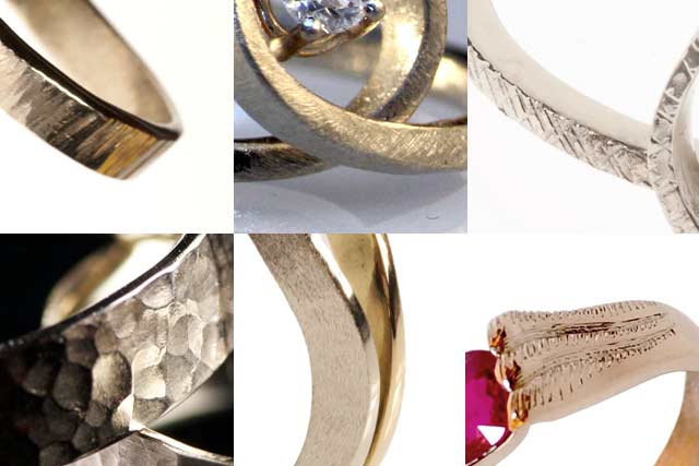 A mio avviso, la finitura dell’anello di fidanzamento fa parte del lungo e meraviglioso lavoro di personalizzazione del gioiello fatto su misura, per questo voglio presentarvi alcuni dei modi in cui si può realizzare. Se osservate la foto, potete notare le diverse texture degli anelli di fidanzamento che ho creato negli ultimi mesi: sei anelli con sei diverse finiture, e sono solo alcuni esempi!