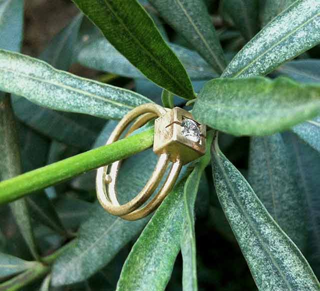 Ho cominciato a progettare ispirandomi alle forme pulite di questo grande architetto e designer, concentrandomi sulla sua produzione di mobili, in particolare sulla celeberrima poltrona LC2. Poi ho realizzato il gioiello, non semplicemente un anello di fidanzamento razionalista ma un anello per una neomamma ispirato espressamente al razionalismo di Le Corbusier: un solitario in oro giallo graffiato, con il castone centrale a cubo e al suo interno un diamante etico da 0,30 carati.
