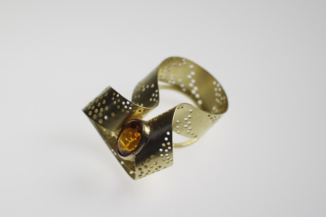 Quello che Mariagrazia desiderava era un anello con quarzo citrino, una pietra dal colore giallo molto caldo che si sposa perfettamente con l’oro giallo. La forma doveva essere originale, perché a Mariagrazia piacciono gli oggetti un po’ stravaganti e ha una passione per i miei gioielli più “strani”, quelli che porto alle mostre e ai concorsi di gioiello contemporaneo e con cui sperimento forme nuove e ardite. Tipo i gioielli che ho portato in mostra al Museum of Arts and design di New York lo scorso ottobre.