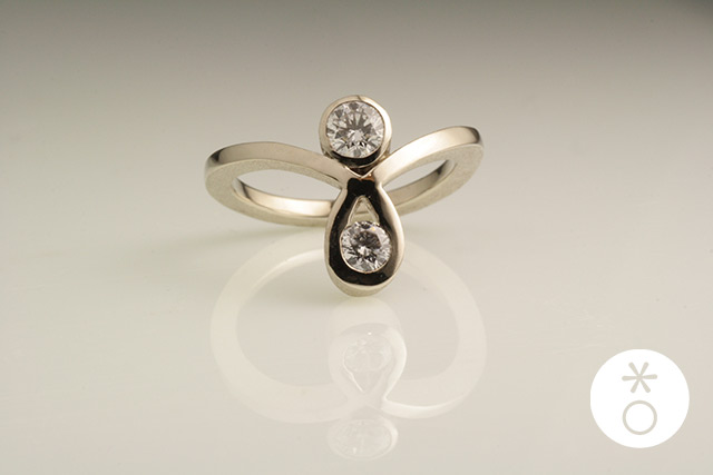 Ho pensato così, per il regalo d’amore di Vincenzo a Ludovica, ad un anello dai contorni sinuosi ma lineari, ispirati alle forme vegetali Liberty d’inizio Novecento. Un anello dal gusto antico con due diamanti di uguale caratura: uno inserito dentro un’asola, l’altro semplicemente accostato. Uno stile vintage, rivisitato però in maniera armoniosa e simmetrica, rispettando le leggi eterne dello spazio e del tempo.