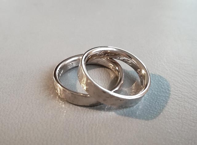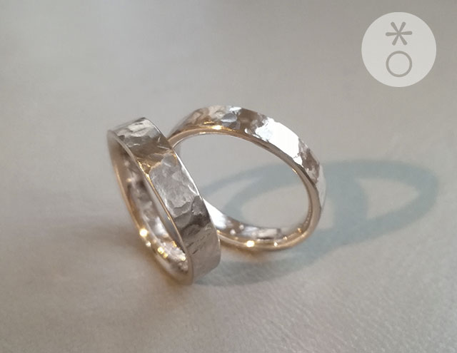 Fedi uniche per Anna e la sua compagna Anna, in oro bianco curvate e martellate.