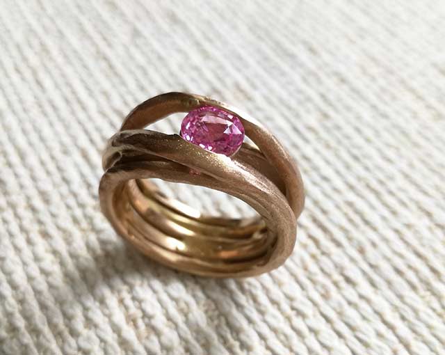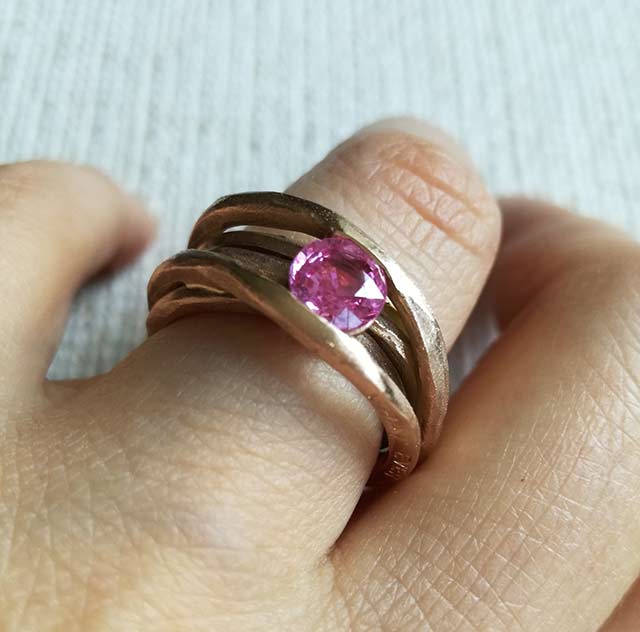 Anello personalizzato con zaffiro rosa da quasi 1 ct, in oro rosa satinato, creato solo per Greta.