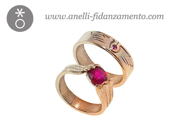 Infine ho plasmato la coppia di anelli di fidanzamento abbinati. Una fede geometrica e maschile per lui, con un piccolo rubino naturale e l’incisione delle ali dell’aeronautica; mentre per lei un solitario con un rubino birmano sorretto da due ali piumate sapientemente incise a bulino e lievemente ritorte.