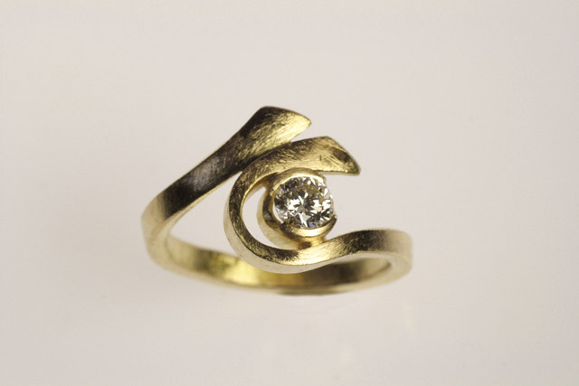 Originale anello in oro giallo graffiato e diamante etico.