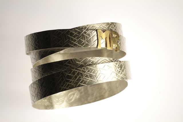 Bracciale personalizzato in argento martellato, con le iniziali dei due fidanzati in oro rosa.