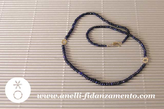 Di recente ho realizzato per conto di Gaia, testimone di una giovane sposa, un girocollo personalizzato con zaffiri blu sfaccettati, alternati a due quadratini battuti in oro bianco con chiusura coordinata. Un regalo di nozze che la sposa ha apprezzato moltissimo, poiché le ricorderà sempre l’amica che era al suo fianco nel giorno del suo matrimonio!