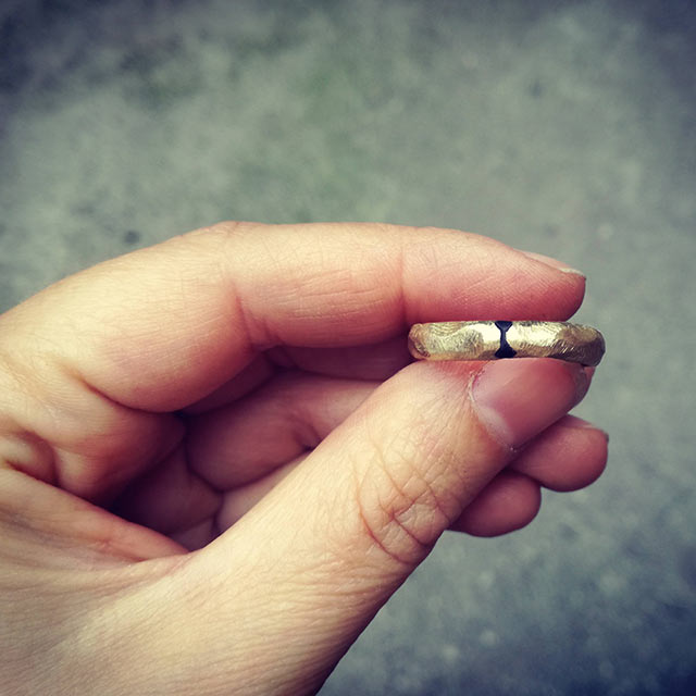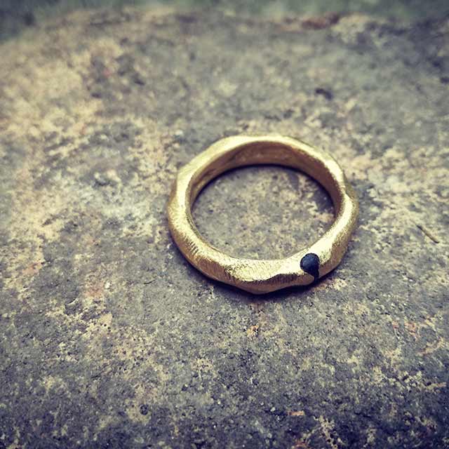 Un anello semplice, originale ed etnico; in oro ed ebano, con diamante etico.