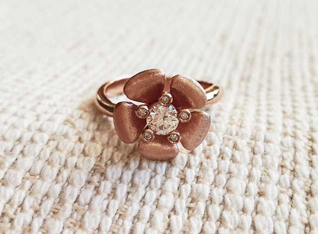 Eva si è mostrata fin da subito disponibile ed è venuta incontro a tutte le mie esigenze prendendo la mia idea e arricchendola con la sua esperienza e capacità. Desideravo un anello che richiamasse realisticamente le forme del fiore di pesco, il preferito di Francesca. Così Eva ha avuto la brillante idea di creare dei pistilli d’oro rosa che tengono 5 punti luce e circondano il diamante centrale, donando luce e personalità all’ anello floreale.